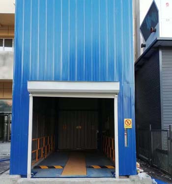 云南汽車管家室外安裝一臺15米4噸立柱式汽車升降平臺,四停四站,帶卷簾門互鎖功能。