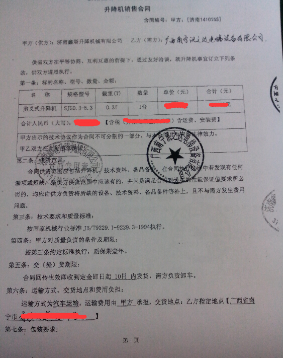 廣東金亨制罐有限公司采購一臺二層導(dǎo)軌式升降機(jī)